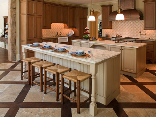 Kuhinje otvorenog plana gotovo uvijek imaju prijelaz između pločica i parketa. On se često nalazi u ravnini s otokom ili malo iza njega. Ako je moguće, ravan je jer jasno definira zonu kuhinje.